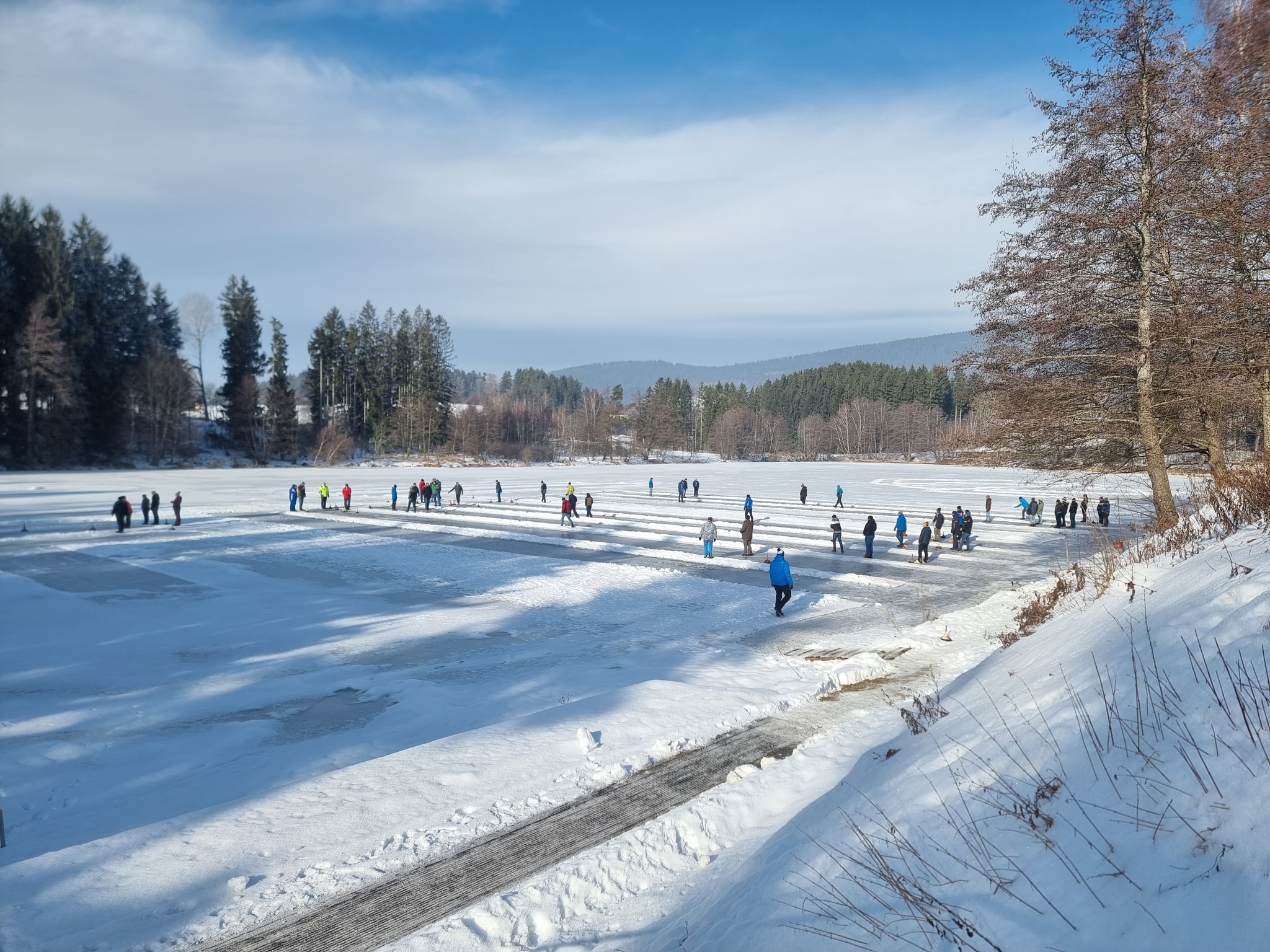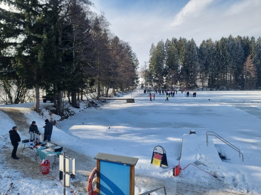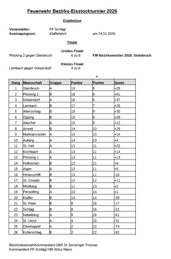 Bei eisigen Temperaturen aber herrlichem Winterwetter ging am Samstag, dem 24. Jänner 2026, am Badesee Klaffer, erstmals wieder nach siebenjähriger Pause, die Feuerwehr Bezirksmeisterschaft im Eisstockschießen über die Bühne. Insgesamt nahmen 26 Moarschaften aus dem gesamten Bezirk Rohrbach teil. Unsere Mannschaft mit Kommandant Thomas Fellhofer, Jürgen Eisner, Peter Magauer und Reinhold Stallinger konnte sich nach durchwachsenem Start fangen und in gewohnter Manier Ihre Leistungen abrufen. Durchsetzen konnte sich schlussendlich im Finale die FF Steinbruch gegen die Moarschaft Plöcking 2. Den dritten Platz am Stockerl holte sich der Titelverteidiger aus Götzendorf. Vielen Dank an die ausrichtende Feuerwehr Schlägl für die perfekte Durchführung.